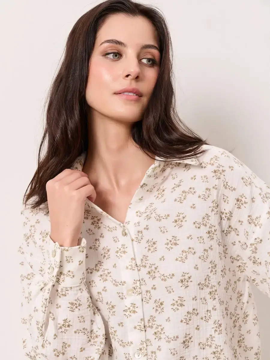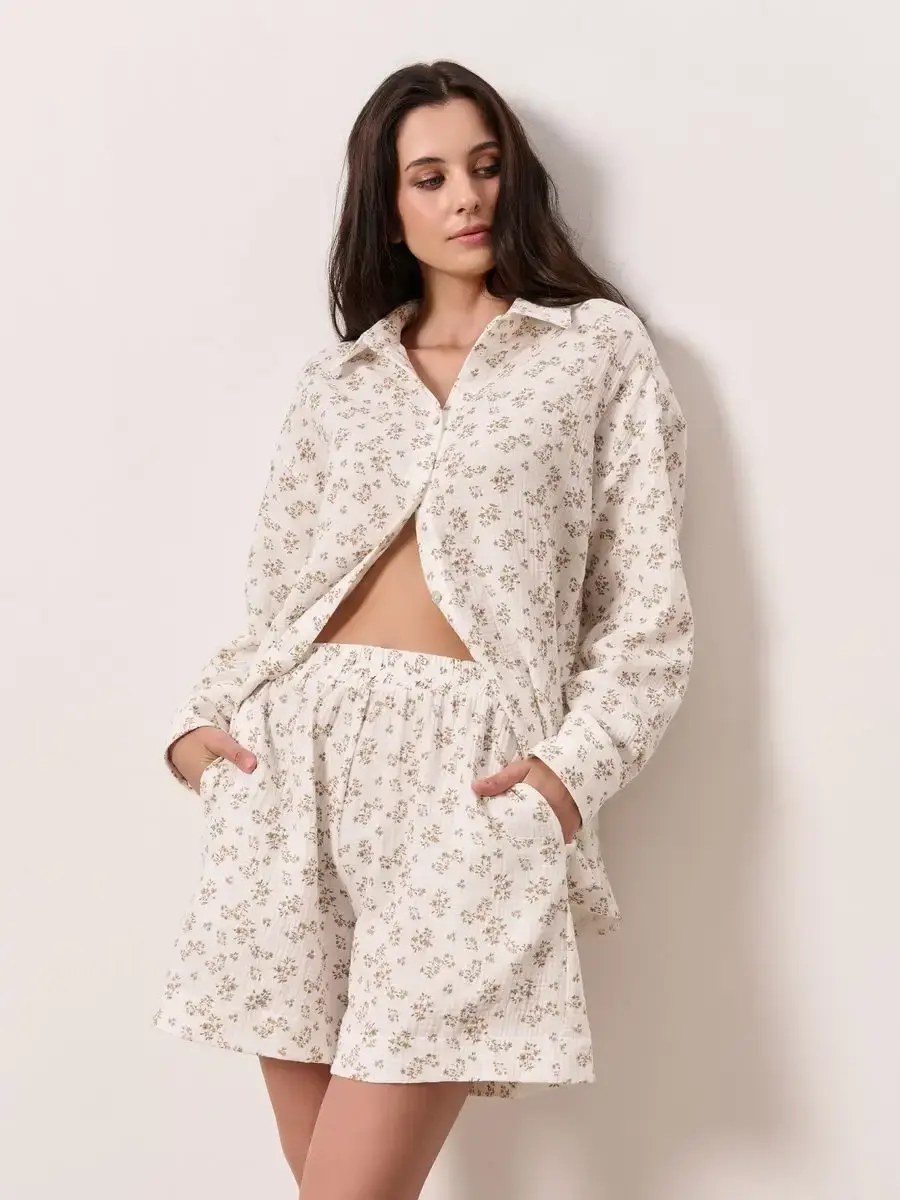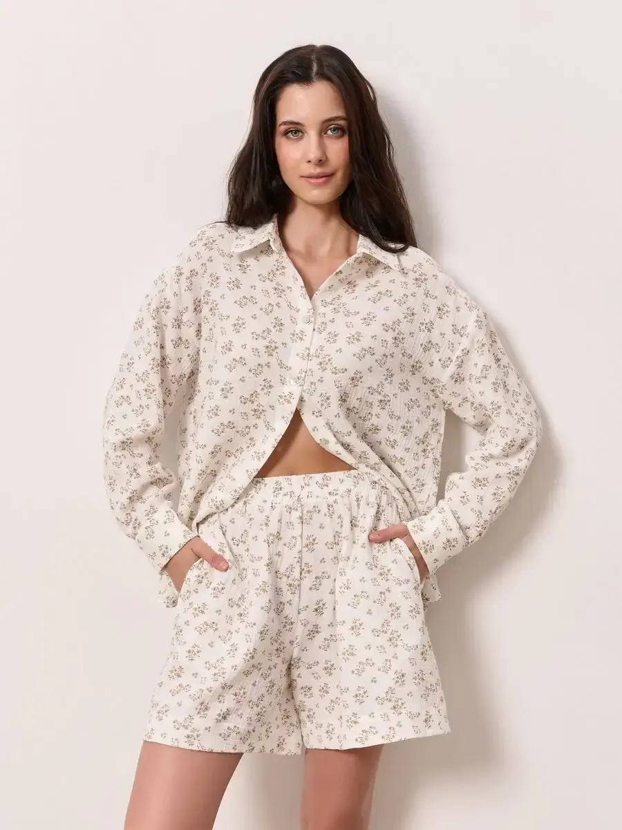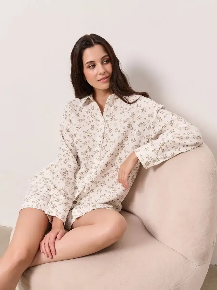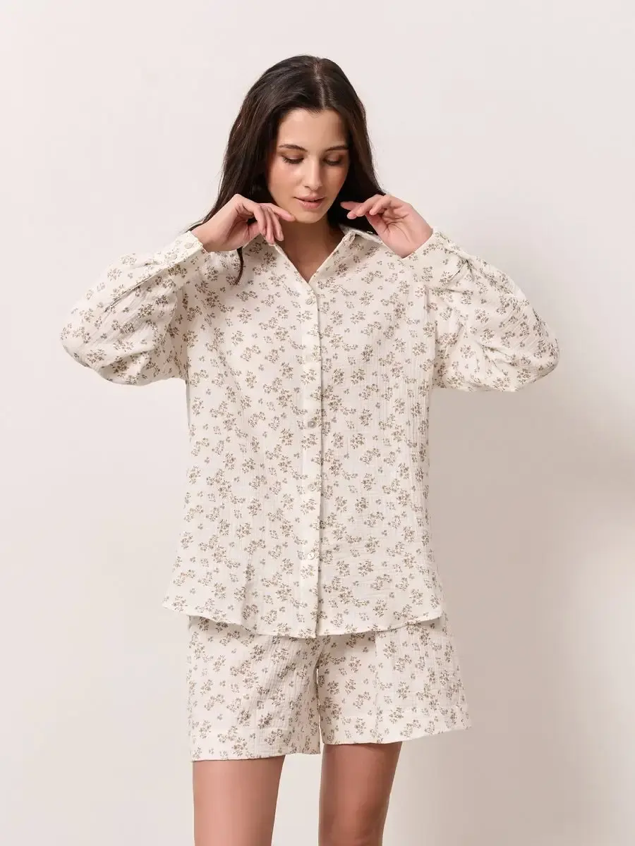 Пижамный костюм рубашка с шортами изготовлен из муслина, 100% хлопок.