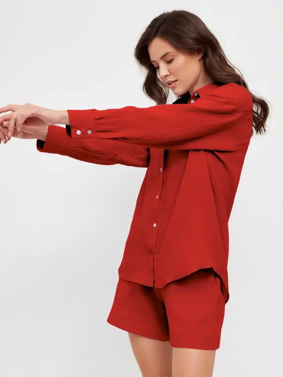 Костюм с шортами женский пижамного стиля. Изготовлен из легкого, нежного муслина. Ткань воздухопроницаема, что позволяет уверенно себя чувствовать на протяжении всего дня. Ткань не вызывает аллергии. Женский костюм из рубашки с шортами свободного кроя нежно и мягко сидит на теле не стесняя движений. Костюм женский подчеркнет женственность и романтичность в образе. Комфортно и удобно носится в течении всего дня.