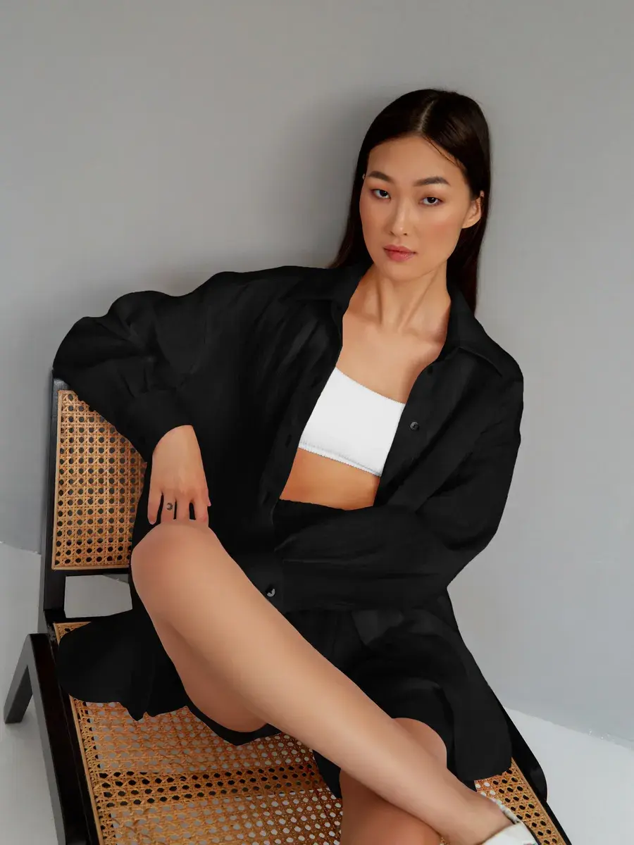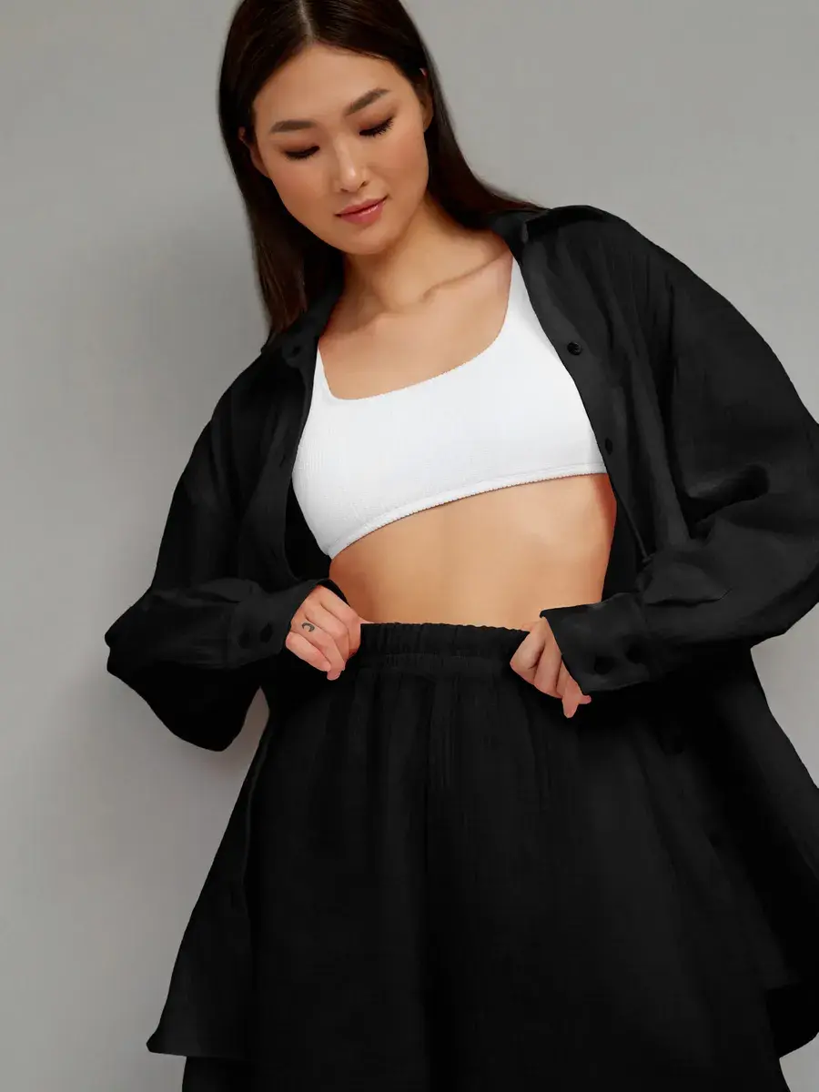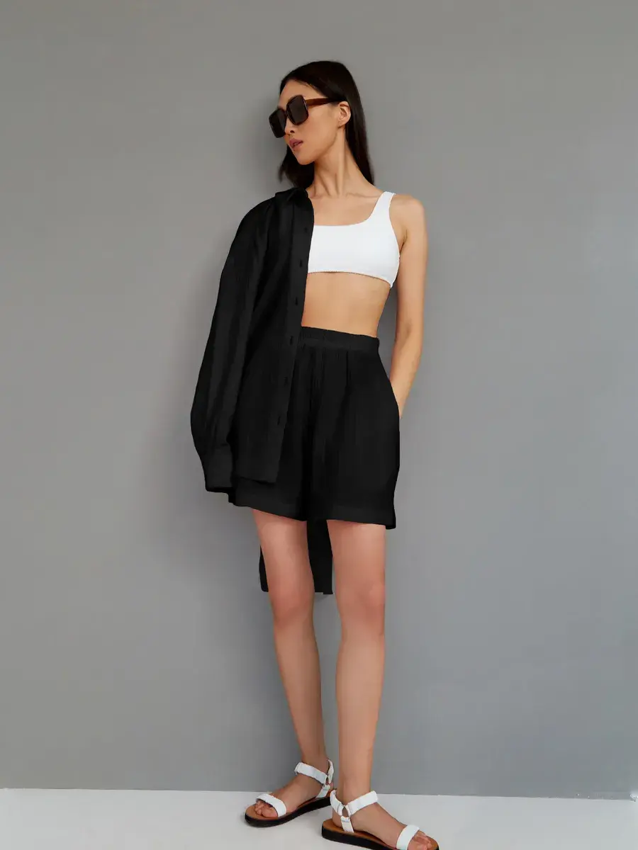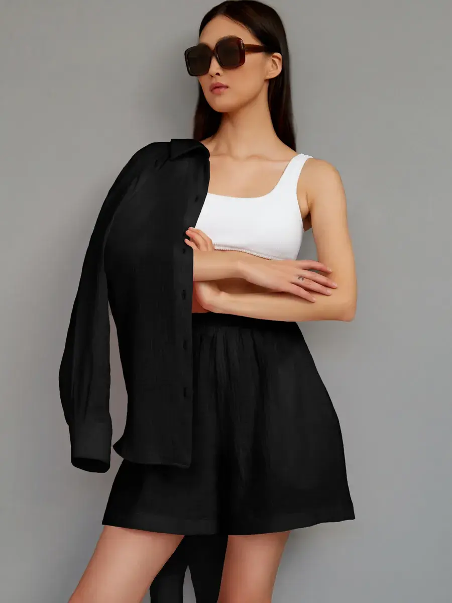 Костюм с шортами женский пижамного стиля. Изготовлен из легкого, нежного муслина. Ткань воздухопроницаема, что позволяет уверенно себя чувствовать на протяжении всего дня. Ткань не вызывает аллергии. Женский костюм из рубашки с шортами свободного кроя нежно и мягко сидит на теле не стесняя движений. Костюм женский подчеркнет женственность и романтичность в образе. Комфортно и удобно носится в течении всего дня.