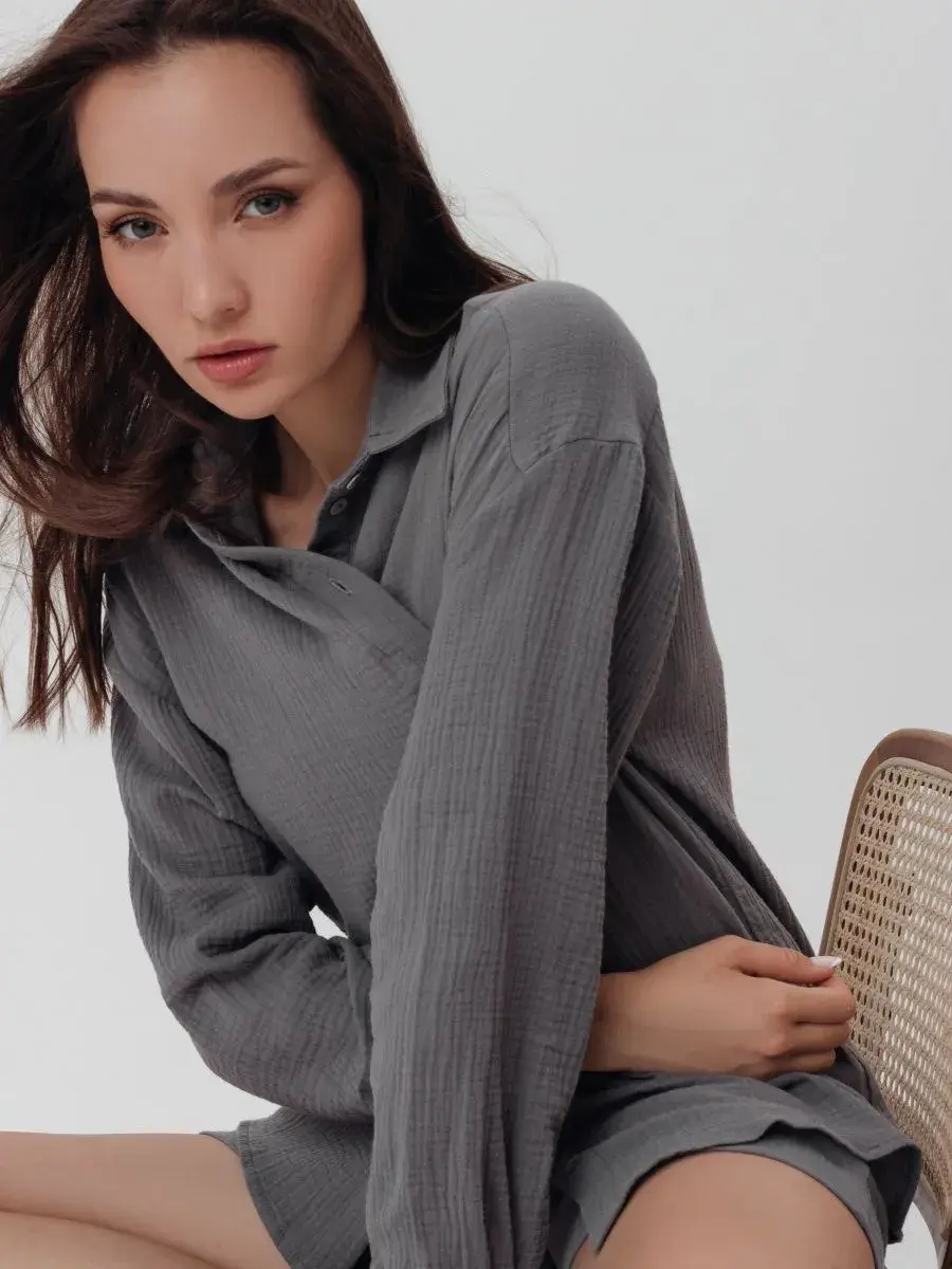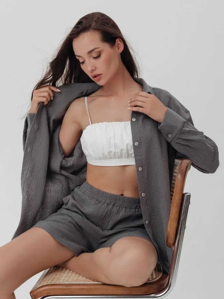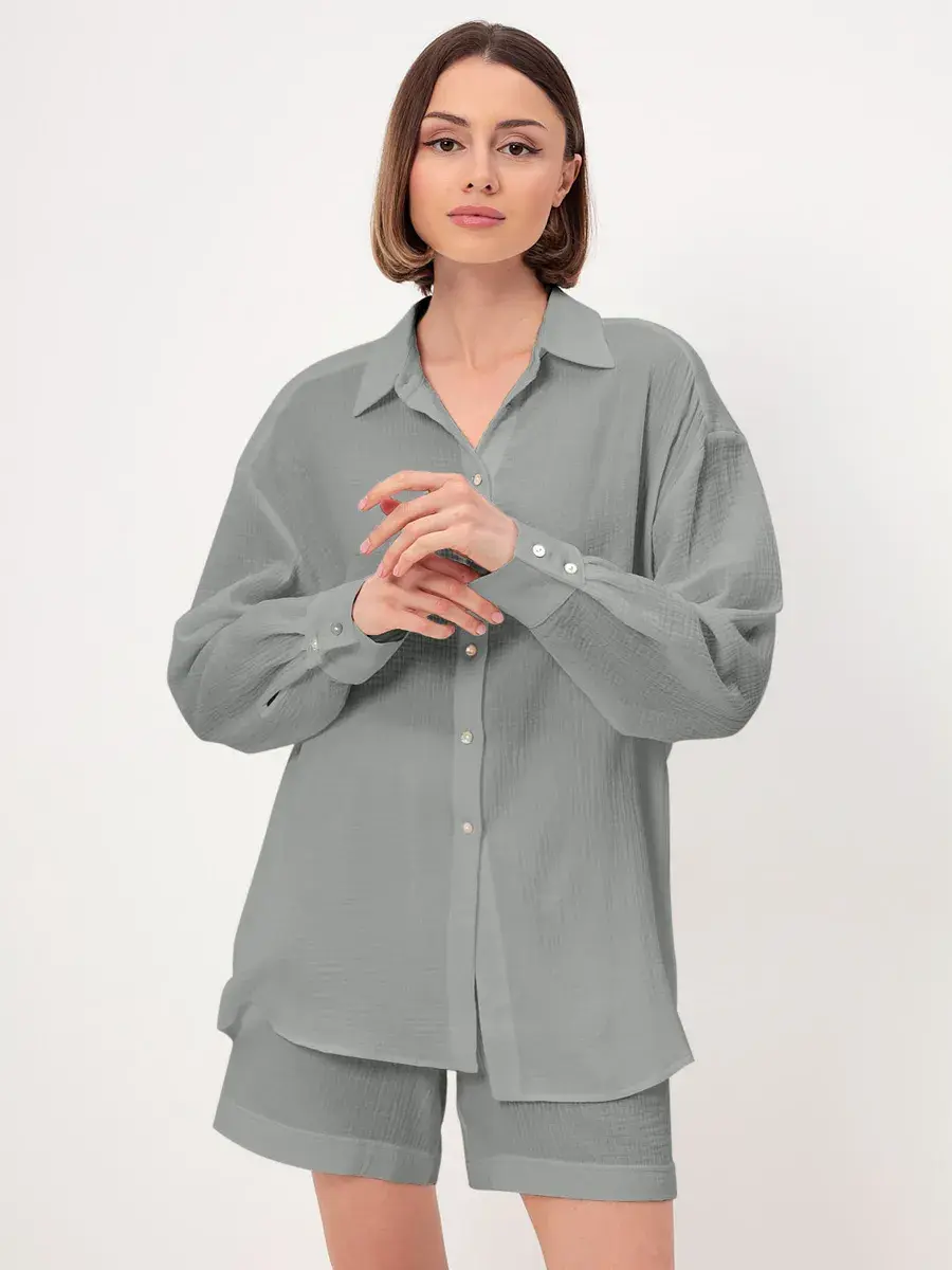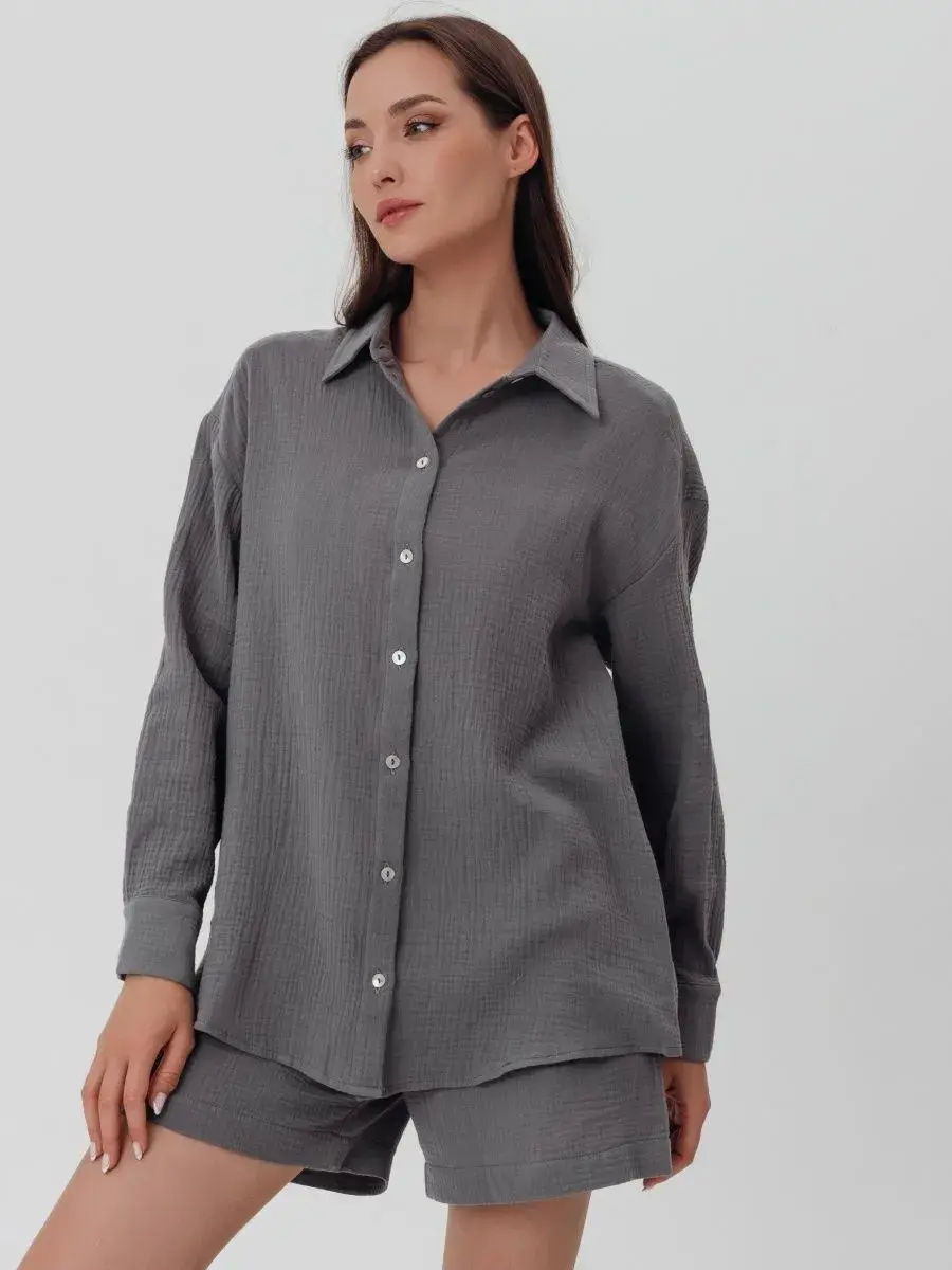 Пижамный костюм рубашка с шортами изготовлен из муслина, 100% хлопок.