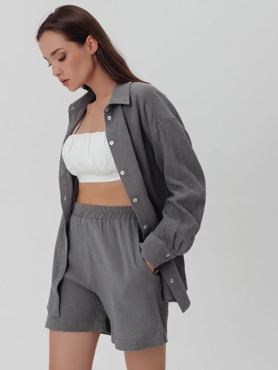 Костюм с шортами женский пижамного стиля. Изготовлен из легкого, нежного муслина. Ткань воздухопроницаема, что позволяет уверенно себя чувствовать на протяжении всего дня. Ткань не вызывает аллергии. Женский костюм из рубашки с шортами свободного кроя нежно и мягко сидит на теле не стесняя движений. Костюм женский подчеркнет женственность и романтичность в образе. Комфортно и удобно носится в течении всего дня.