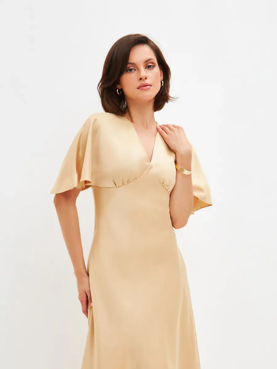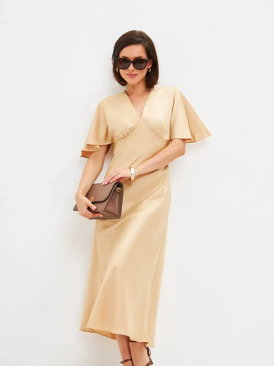 Шелковое платье комбинация с рукавами крылышками и V – образным вырезом отличный выбор для любого мероприятия. Струящаяся ткань, придаст парящий, нежный образ женственности. Платье женское благодаря шелковой ткани изящно блестит и переливается при скольжении во время ходьбы, не оставит вас незамеченной. Платье комбинация с рукавами подходит как для коктейльной вечеринки так и для торжественного события, а также может стать нарядным офисным образом. Прекрасно подойдет для свидания и прогулки, как одежда для нового года, дня рождения, платье для подружки невесты. Форма платья и качество пошива подчеркивает изящную линию фигуры и придает элегантный вид. Благодаря свободному покрою подходит на любую фигуру, даже беременным, подчеркнет и украсит небольшой животик будущей мамы. Модное платье из шелка хорошо сочетается с пиджаком, свитером, блейзером. Это платье придаст вам легкость, игривость и очарование. Широкий размерный ряд позволяет выбрать женское платье больших размеров (50, 52).