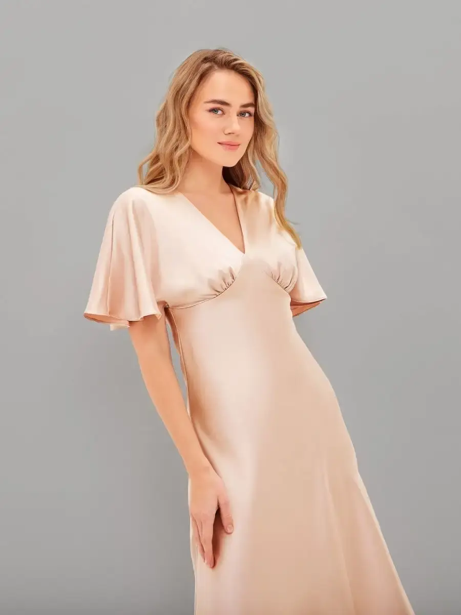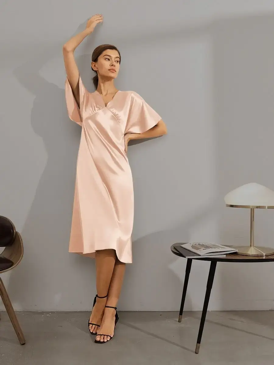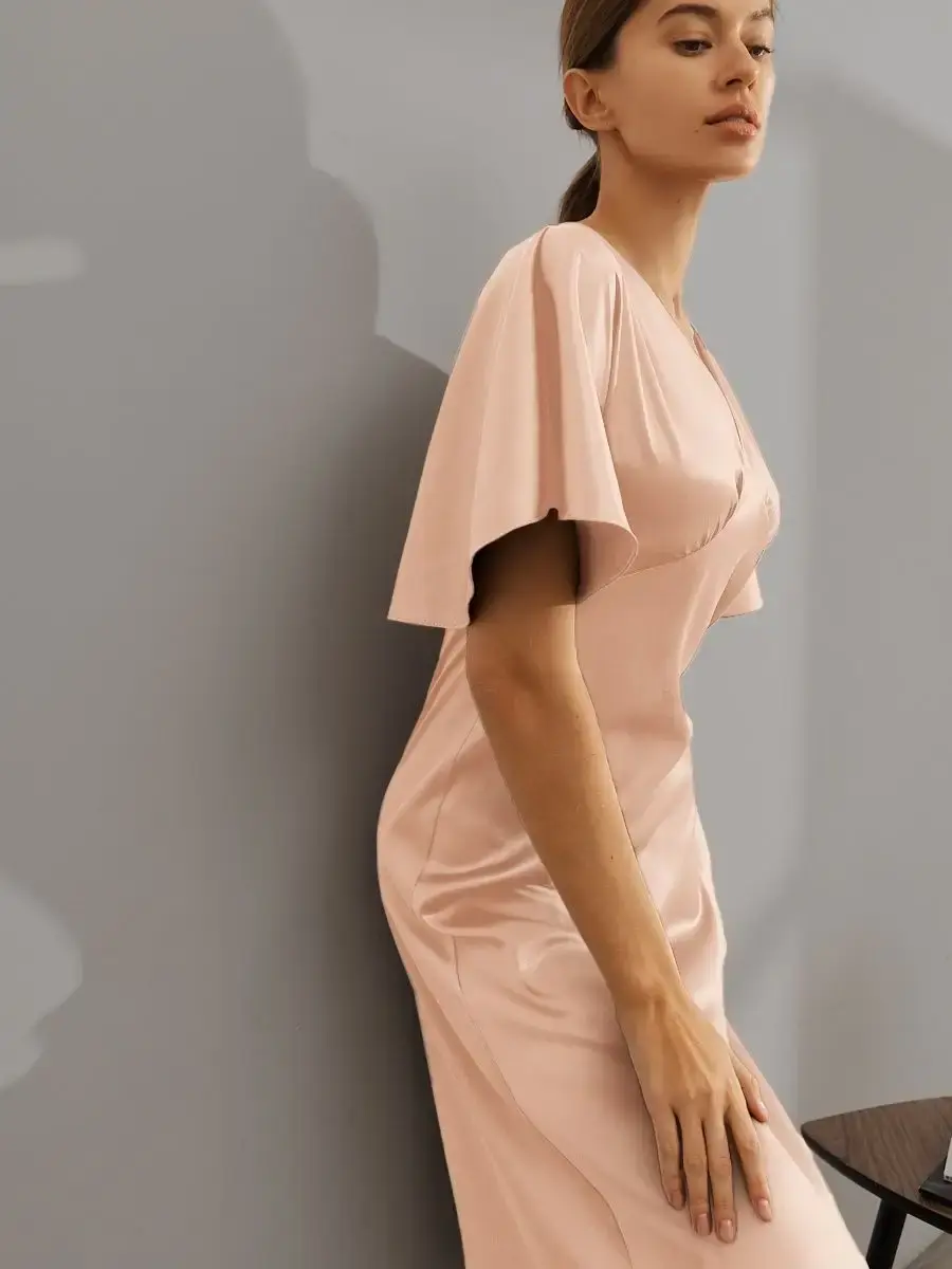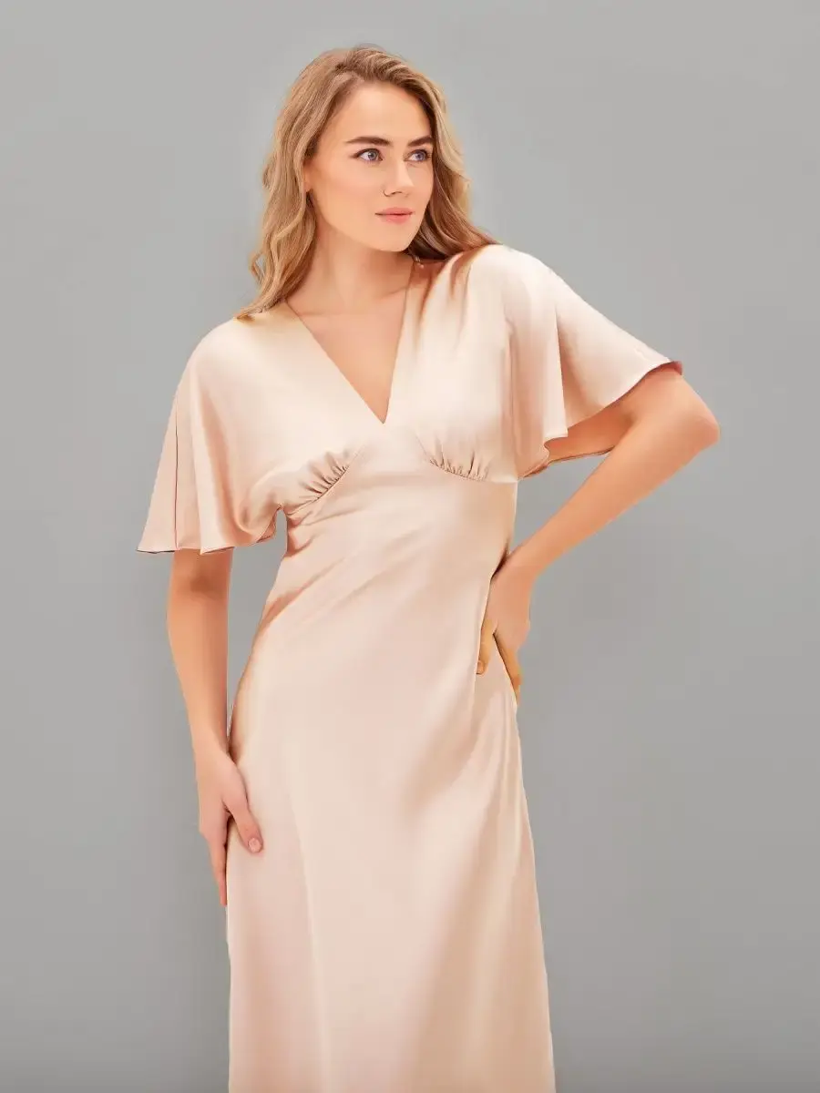 Шелковое платье комбинация с рукавами крылышками и V – образным вырезом отличный выбор для любого мероприятия. Струящаяся ткань, придаст парящий, нежный образ женственности. Платье женское благодаря шелковой ткани изящно блестит и переливается при скольжении во время ходьбы, не оставит вас незамеченной. Платье комбинация с рукавами подходит как для коктейльной вечеринки так и для торжественного события, а также может стать нарядным офисным образом. Прекрасно подойдет для свидания и прогулки, как одежда для нового года, дня рождения, платье для подружки невесты. Форма платья и качество пошива подчеркивает изящную линию фигуры и придает элегантный вид. Благодаря свободному покрою подходит на любую фигуру, даже беременным, подчеркнет и украсит небольшой животик будущей мамы. Модное платье из шелка хорошо сочетается с пиджаком, свитером, блейзером. Это платье придаст вам легкость, игривость и очарование. Широкий размерный ряд позволяет выбрать женское платье больших размеров (50, 52).