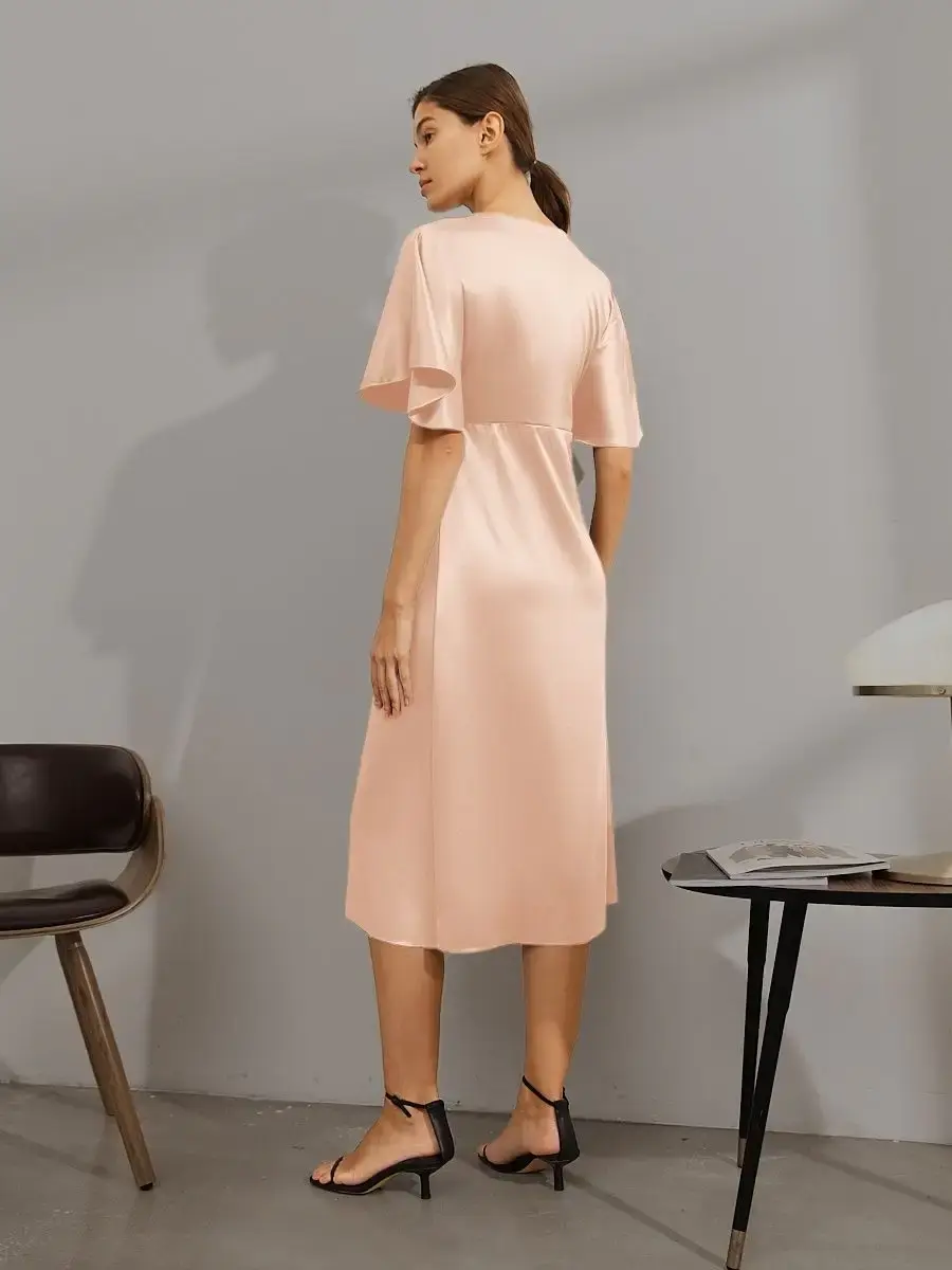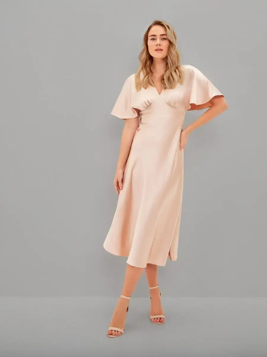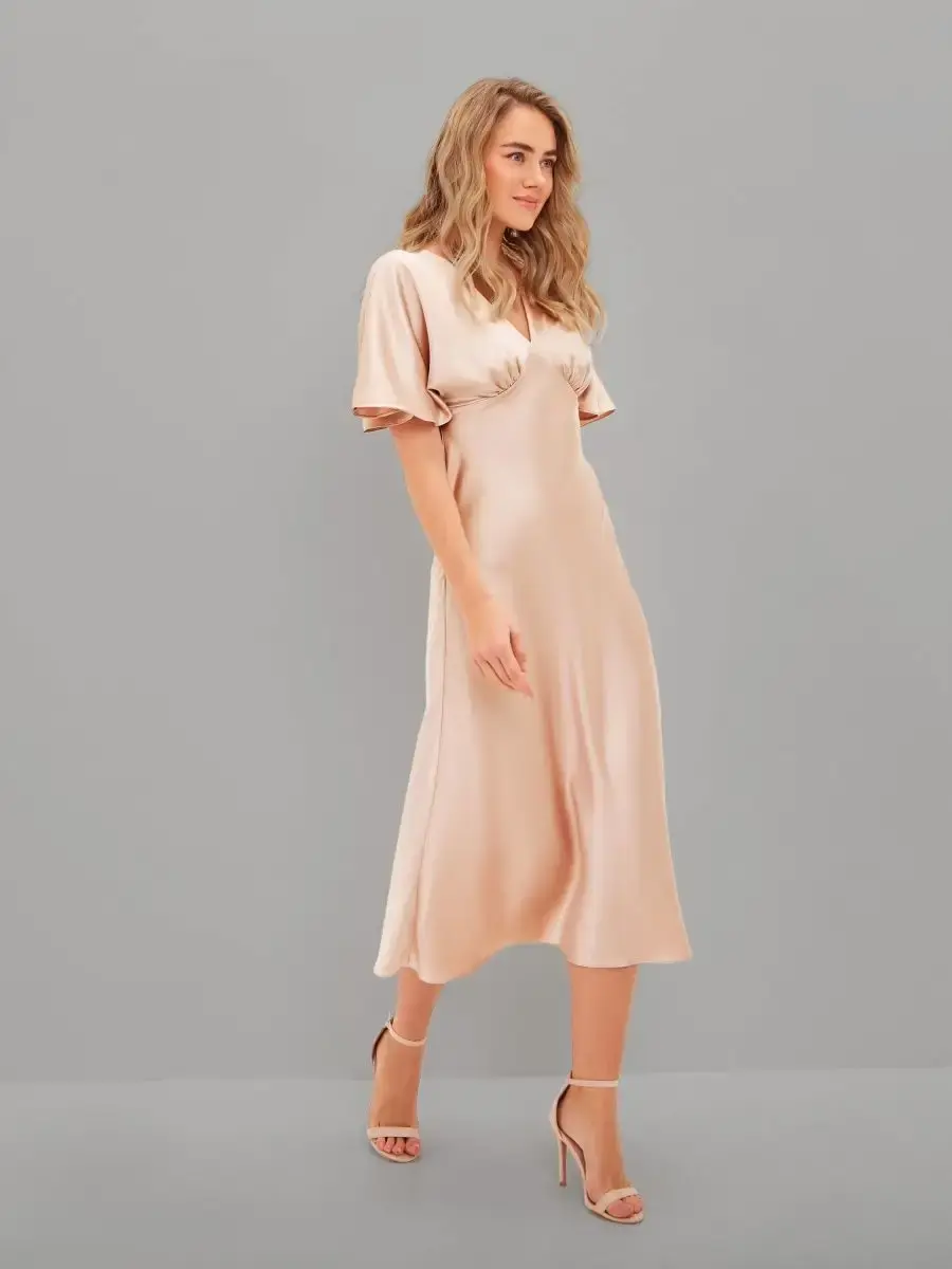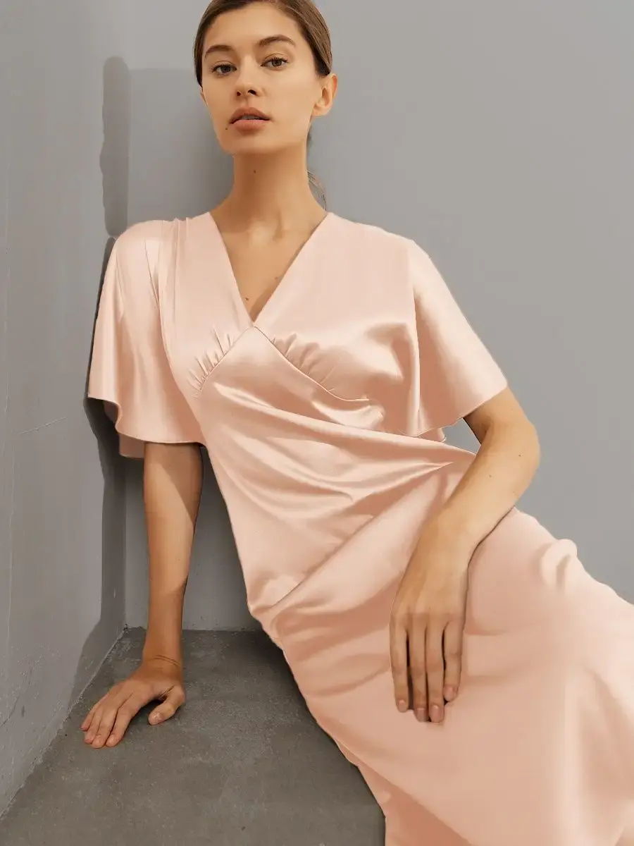 Шелковое платье комбинация с рукавами крылышками и V – образным вырезом отличный выбор для любого мероприятия. Струящаяся ткань, придаст парящий, нежный образ женственности. Платье женское благодаря шелковой ткани изящно блестит и переливается при скольжении во время ходьбы, не оставит вас незамеченной. Платье комбинация с рукавами подходит как для коктейльной вечеринки так и для торжественного события, а также может стать нарядным офисным образом. Прекрасно подойдет для свидания и прогулки, как одежда для нового года, дня рождения, платье для подружки невесты. Форма платья и качество пошива подчеркивает изящную линию фигуры и придает элегантный вид. Благодаря свободному покрою подходит на любую фигуру, даже беременным, подчеркнет и украсит небольшой животик будущей мамы. Модное платье из шелка хорошо сочетается с пиджаком, свитером, блейзером. Это платье придаст вам легкость, игривость и очарование. Широкий размерный ряд позволяет выбрать женское платье больших размеров (50, 52).