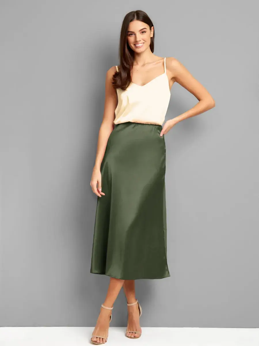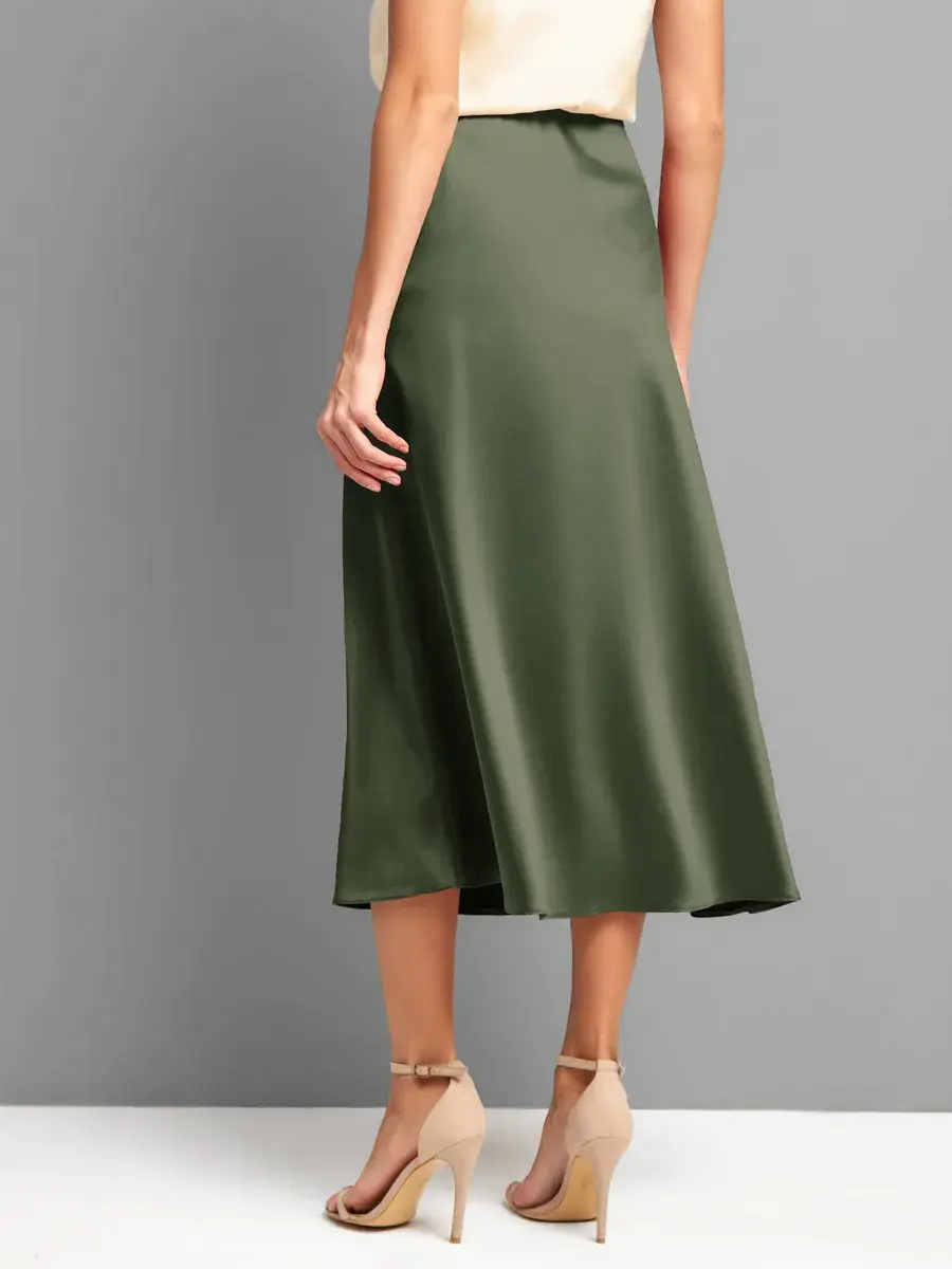 Весенняя юбка, хаки, атласная плотная , шелковая на резинке