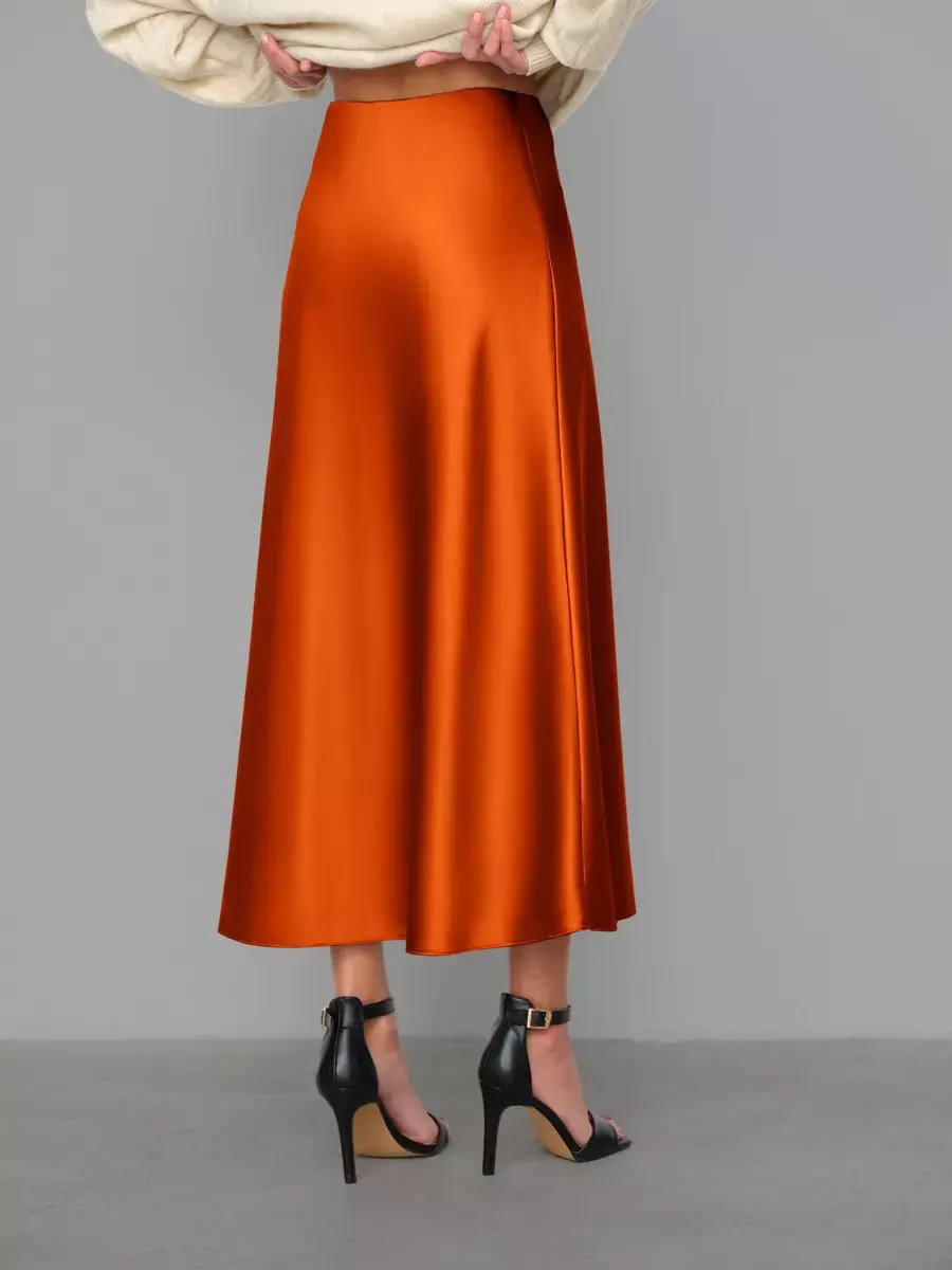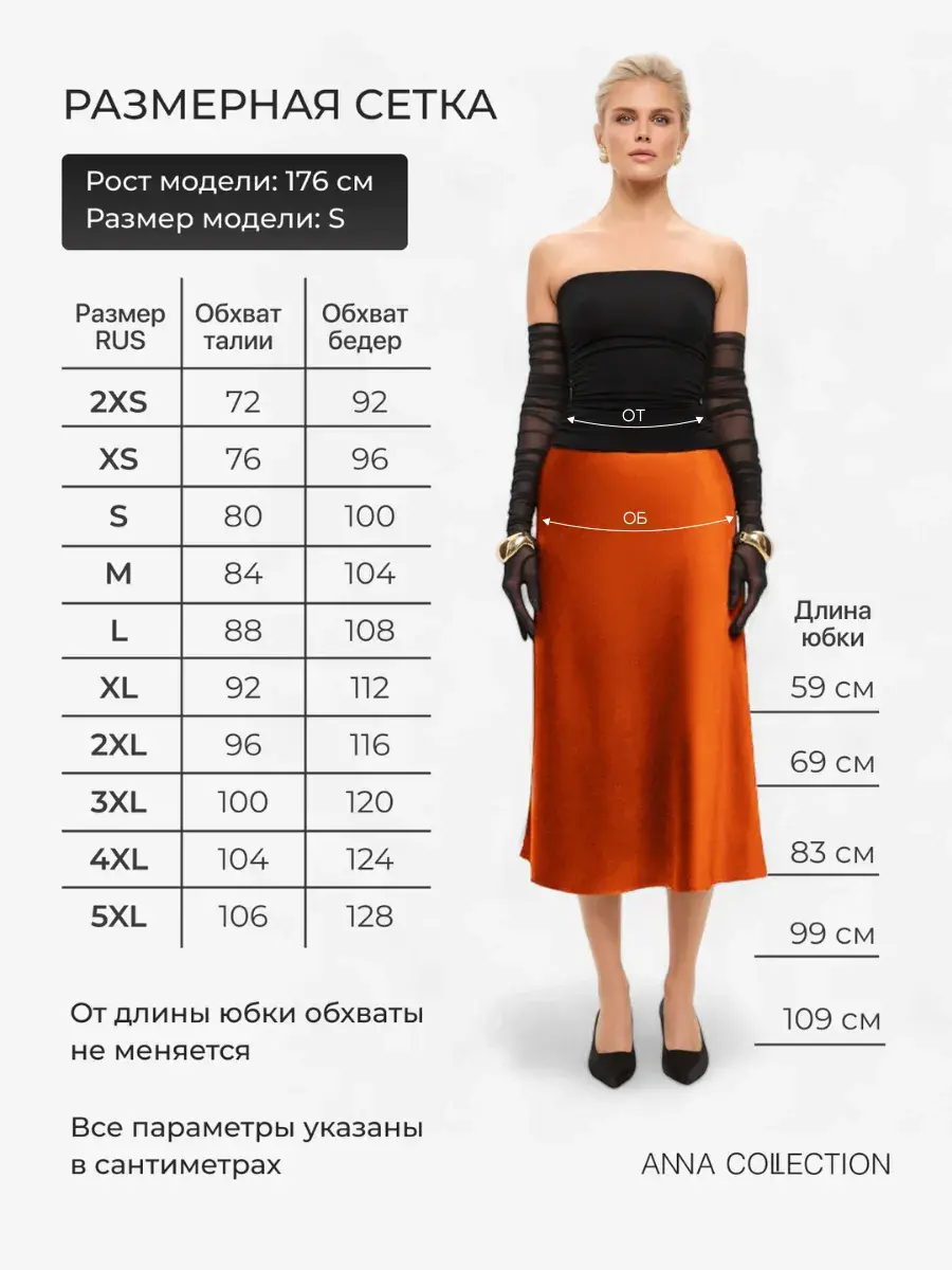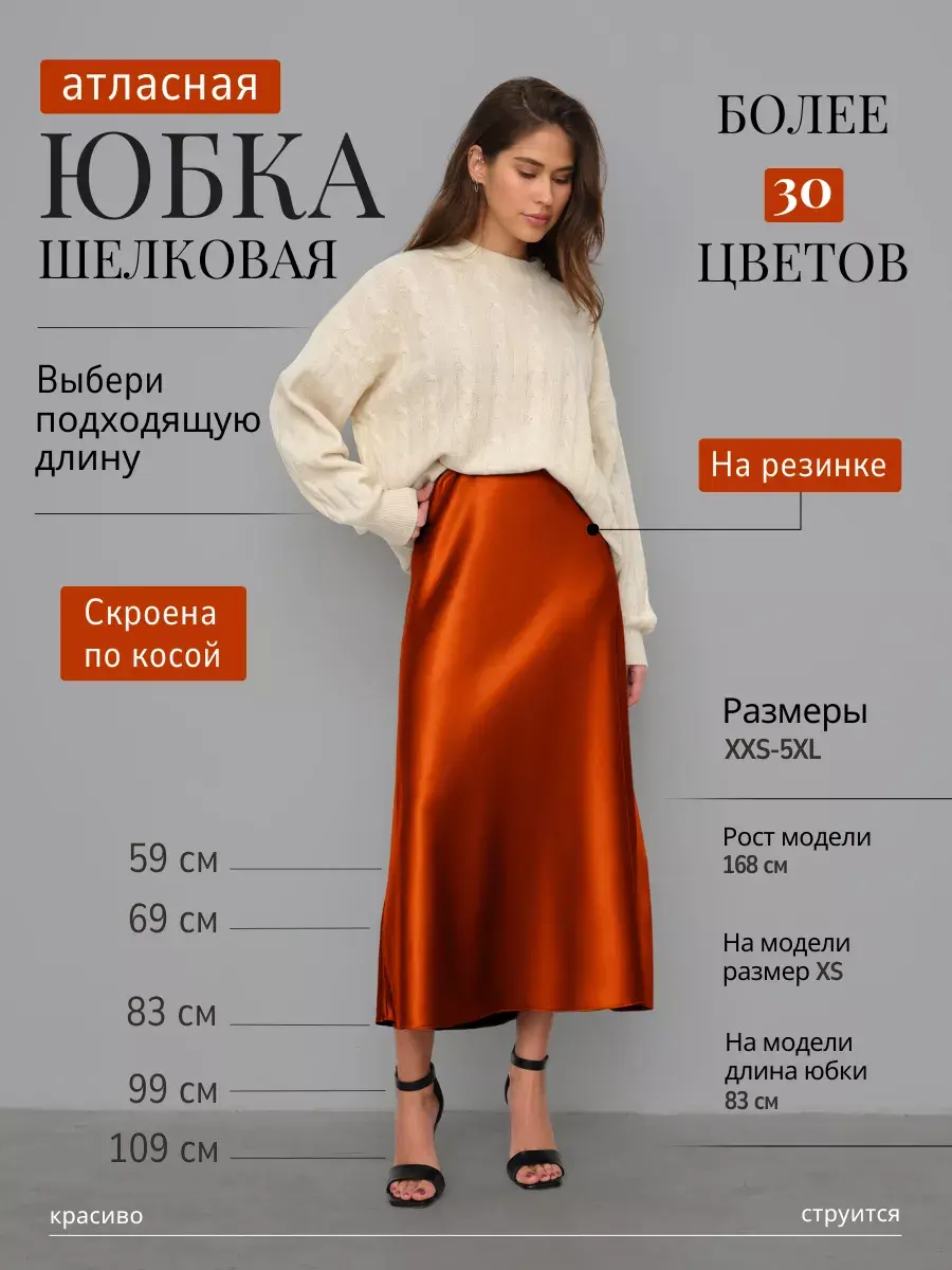 Уважаемые покупательницы! Рекомендуем при выборе ростовки ориентироваться на длину юбки по боковому шву, не по своему росту. Таким образом вы сможете подобрать, ту длину, которая идеально вам подойдет. Мы юбки в 5-х длинах, чтобы каждая девушка смогла выбрать себе подходящую. Длина по боковому шву: 59 см, 69 см, 83 см, 99 см, 109 см. Вы можете выбрать любую ростовку! Атласная юбка - хит уже не первого сезона и эталон минимализма. Юбка с завышенной талией шьется по косой (под углом 45 градусов) эта ткань хорошо растяжима. И поэтому на участках косины ткань вытягивается по длине под тяжестью собственного веса, а там, где она больше приближена к долевому или поперечному направлениям,-нет. Шелковая юбка из плотной ткани терракотового цвета, длина мини, миди , макси, базовая вещь в гардеробе у каждой девушки. Юбка длинная без подклада, пояс на резинке. Офисная юбка идеально сочетается с футболками, с женскими топами, объёмными и прилегающими джемперами и лаконичной базовой обувью, а также с топом на тонких бретелях и туфлями на высоком каблуке. В женской юбке Вы будете неотразимы на вечеринке, на выпускном, в офисе, на свадьбе. Благодаря отсутствию подклада шелковая ткань изящно струится по вашим ногам подчеркивая манящий, сексуальный, чарующий вид. Длинная юбка трапеция визуально вытянет вашу фигуру, и придаст элегантность внешнего вида, при этом не сковывая движений. Наши юбки ANNA COLLECTION мы шьем сами. Наша цель, удовлетворение качеством нашей продукции любую женщину. Мы тщательно следим за технологией, используем только лучшие шелковые ткани. Каждая юбка проходит проверку на качество материала, пошива и обработки. Это шикарный наряд как для офисного стиля, так и для праздничного настроения. Такая юбка впишется в любой гардероб, её можно легко комбинировать под любой образ, как для офиса, так и для свидания, и т.д. А так же за счёт удобного кроя, она отлично подойдёт для ежедневной носки. Для высоких и невысоких, большие размеры.