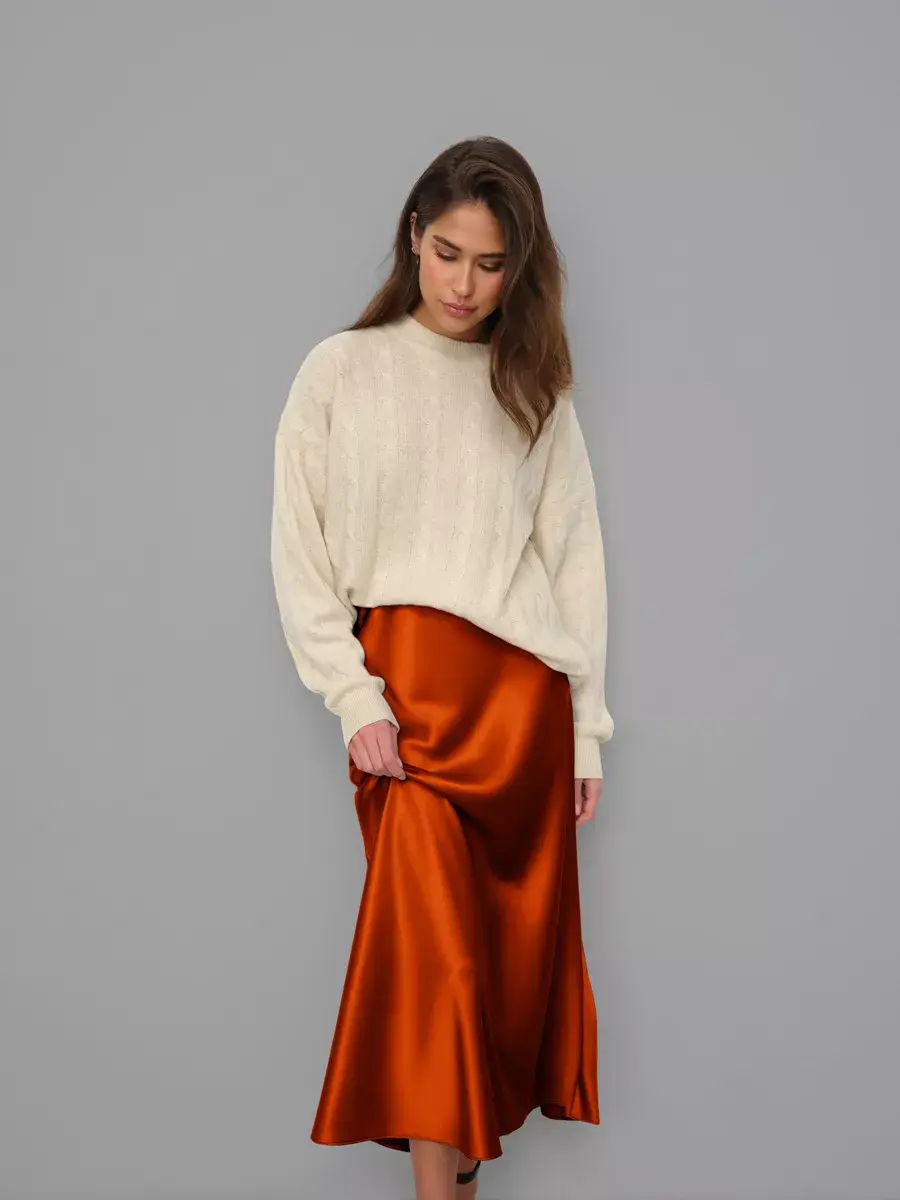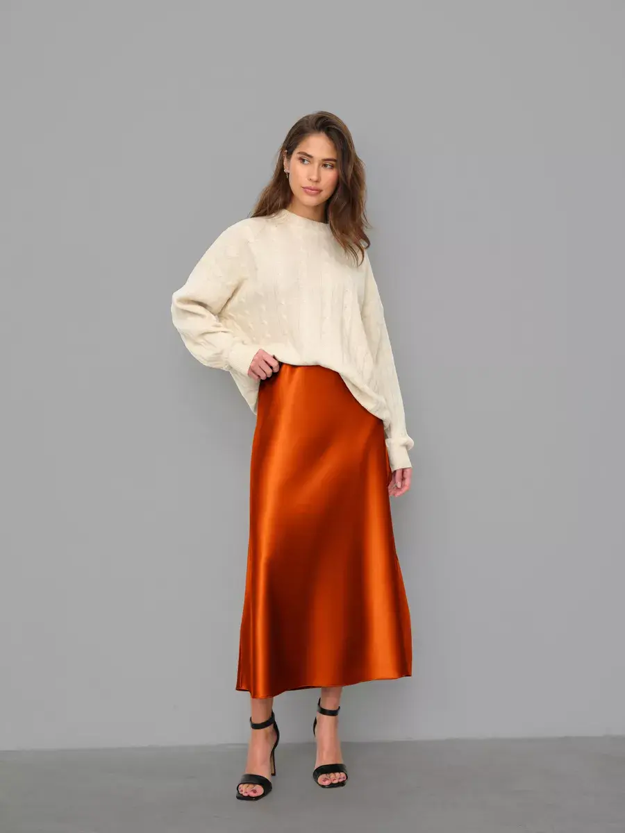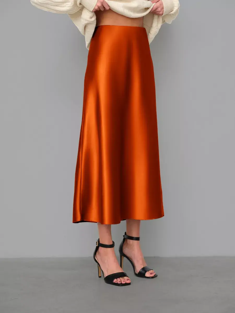 Уважаемые покупательницы! Рекомендуем при выборе ростовки ориентироваться на длину юбки по боковому шву, не по своему росту. Таким образом вы сможете подобрать, ту длину, которая идеально вам подойдет. Мы юбки в 5-х длинах, чтобы каждая девушка смогла выбрать себе подходящую. Длина по боковому шву: 59 см, 69 см, 83 см, 99 см, 109 см. Вы можете выбрать любую ростовку! Атласная юбка - хит уже не первого сезона и эталон минимализма. Юбка с завышенной талией шьется по косой (под углом 45 градусов) эта ткань хорошо растяжима. И поэтому на участках косины ткань вытягивается по длине под тяжестью собственного веса, а там, где она больше приближена к долевому или поперечному направлениям,-нет. Шелковая юбка из плотной ткани терракотового цвета, длина мини, миди , макси, базовая вещь в гардеробе у каждой девушки. Юбка длинная без подклада, пояс на резинке. Офисная юбка идеально сочетается с футболками, с женскими топами, объёмными и прилегающими джемперами и лаконичной базовой обувью, а также с топом на тонких бретелях и туфлями на высоком каблуке. В женской юбке Вы будете неотразимы на вечеринке, на выпускном, в офисе, на свадьбе. Благодаря отсутствию подклада шелковая ткань изящно струится по вашим ногам подчеркивая манящий, сексуальный, чарующий вид. Длинная юбка трапеция визуально вытянет вашу фигуру, и придаст элегантность внешнего вида, при этом не сковывая движений. Наши юбки ANNA COLLECTION мы шьем сами. Наша цель, удовлетворение качеством нашей продукции любую женщину. Мы тщательно следим за технологией, используем только лучшие шелковые ткани. Каждая юбка проходит проверку на качество материала, пошива и обработки. Это шикарный наряд как для офисного стиля, так и для праздничного настроения. Такая юбка впишется в любой гардероб, её можно легко комбинировать под любой образ, как для офиса, так и для свидания, и т.д. А так же за счёт удобного кроя, она отлично подойдёт для ежедневной носки. Для высоких и невысоких, большие размеры.