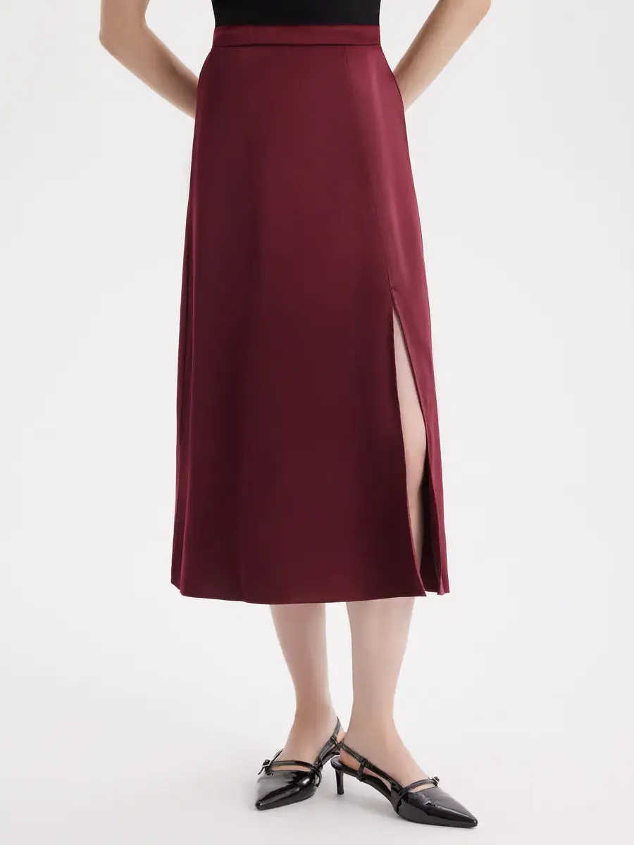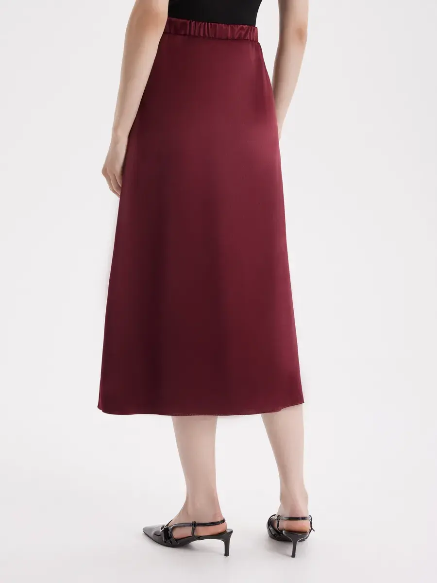 бордовая атласная юбка миди трапеция на резинке