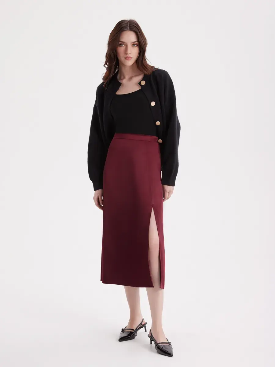 Юбка атласная с разрезом от бренда ANNA COLLECTION - это изысканный выбор для женщин, предпочитающих комфорт и стиль. Этот элегантный аксессуар изготовлен из плотного искусственного шелка, что обеспечивает его шелковистую фактуру и приятную на ощупь поверхность. Шелковая юбка миди имеет среднюю длину 83 см, что делает её идеальным выбором для офисной и деловой работы, новогодних праздников и повседневного ношения.